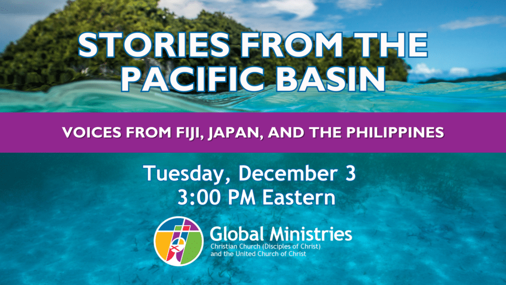 As part of the Pacific Basin Initiative Week, please join us for stories and updates from Global Ministries’ East Asia and Pacific partners in a webinar at 3:00 pm, Dec. 3. Frances Namoumou, Program Manager with the Pacific Conference of Churches in Fiji, will discuss the ecumenical partner’s Climate Change work and their new sustainable agriculture project, the Vulagi Eco-Farm and Training Center. Martha Mensendiek, long-time mission co-worker in Kyoto, Japan, will lift up stories of staff and visitors who have been transformed by the outreach of the Bazaar Café, a bold witness of the United Church of Christ in Japan to marginalized communities in the Kyoto area. Voices from Silliman University Divinity School in Dumaguete, Philippines, will share about the school’s growing Music and Liturgy degree program, which integrates indigenous Filipino song and instrumentation as part of its formation of students for ministry in the United Church of Christ in the Philippines. Register here.
