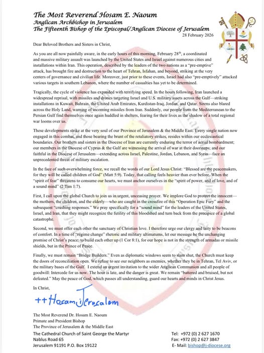 - Episcopal Diocese of Jerusalem & the Middle East Archbishop Hosam Naoum shares pastoral letter in light of escalating conflict (Feb. 28, 2026)